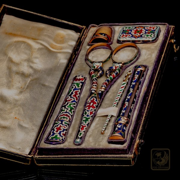 This sewing or embroidery kit is made of gold with extraordinary precision and attention to detail. The beautiful multicolor enamels cover even the smallest surfaces of individual elements. In the leather case decorated with the method of kurdyban there are: thimble, needle holder, container with needles, scissors with cover, eyelet needle and pencil holder. The tool set dates back to 1840, the year when every lady from the aristocracy, apart from painting, playing an instrument or learning foreign languages, had to know the basics of embroidery. The production of the set is attributed to Jean Francois Bautte's studio.