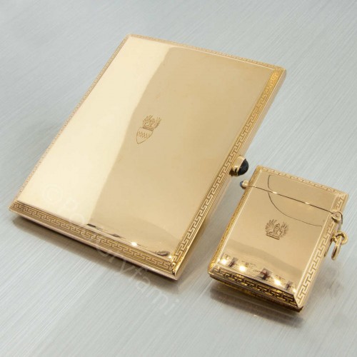 Elegancki, gustowny komplet będący synonimem luksusu wykonany w 18 karatowym złocie w pierwszej połowie XX wieku. Idealnie gładka lśniąca powierzchnia papierośnicy jak i etui na zapałki ozdobiona na rancie greckim meandrem. Zamknięcia dekorowane szafirem szlifowanym w kaboszon. Całość wyszła spod ręki mistrza złotnictwa z niemieckiej pracowni Louis Kuppenheima.
