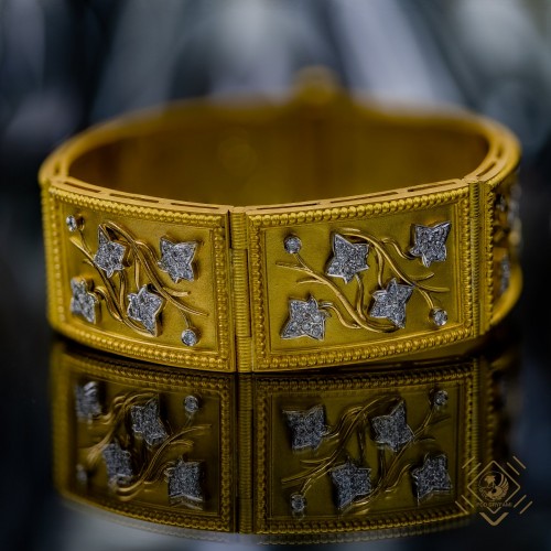 Niezwykle rzadko spotykany wzór bransolety. Na sześciu wykonanych z 18 karatowego złota prostokątnych płytkach połączonych zawiasami zaprojektowano delikatny kwiatowy wzór. Niewielkie łodyżki łączą ze sobą wypełnione diamentami kwiaty oraz pączki kwiatowe. Zmyślne zapięcie z dodatkowym zabezpieczeniem to niewątpliwie kolejny atut tego niezwykłego klejnotu.