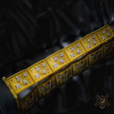 An extremely rare bracelet pattern. A delicate floral pattern designed on six rectangular plates made of 18 carat gold, connected by hinges. Small stems combine diamond-filled flowers and flower buds. A clever clasp with additional protection is undoubtedly another attraction of this unusual jewel.
