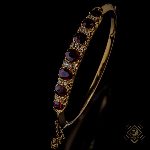 Prosta forma złożona z dwóch półobręczy połączonych zawiasem doskonale koresponduje z diamentami i granatami. Idealnie dobrane diamenty tworzą delikatną poświatę dla podkreślenia karminowoczerwonej barwy piropów minerałów należących do grupy granatów.