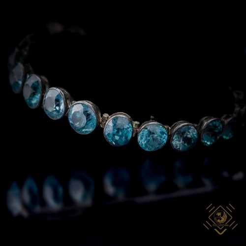 Nietuzinkowe, rzadko spotykane cyrkony w odcieniu ciemnego błękitu o nieregularnych szlifach oprawione w patynowane srebro tworzą wspaniałą bransoletę. Prosta oprawa podkreśla urodę kamieni a wykonane ze złota techniką filigranu zapięcie dopełnia całości. Klejnot zachwyca błękitną poświatą zdającą się emanować z różnorodnie dobranych, ciekawie oszlifowanych cyrkonów.