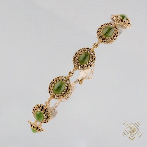 Bransoleta wykonana ze złota kameryzowana owalnymi nefrytowymi kaboszonami. Lekko połyskująca ciemnozielona barwa nefrytu idealnie skomponowana z kolorem starego złota przebogatej misternie wykonanej oprawy. Niezwykle wdzięczna, bardzo kobieca forma idealnie układająca się na przegubie dłoni.