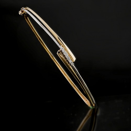 Uroczy drobiazg pasujący na każdą okazję. Wykonana z białego i żółtego złota obręcz delikatnie ozdobiona diamentami.