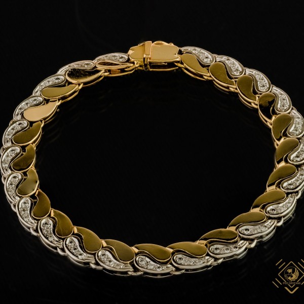 A fancy pattern designed in two-colour gold, warm yellow combined with delicate white. The elements made of white gold have been additionally "frosted" with small shiny diamonds. The bracelet fits delicately on the wrist. Clasp with additional security. On the underside of the clasp there is a Chimento mark.