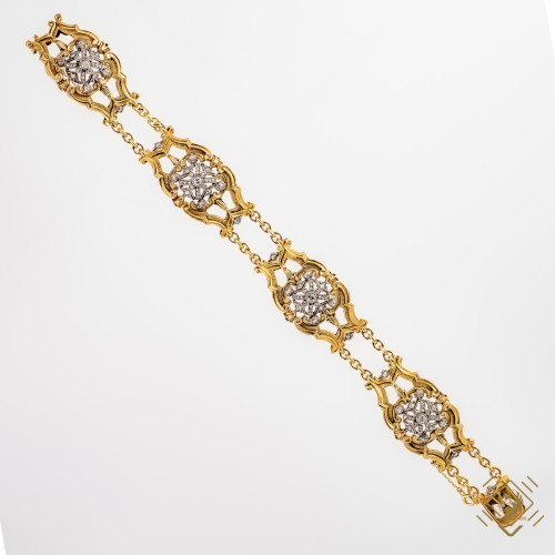 Oryginalna forma składająca się z czterech ruchomych repusowanych i cyzelowanych wykonanych ze złota ogniw, których centralnym punktem są oprawione w srebro diamenty starego szlifu oraz dyskretnie połyskujące rozety diamentowe. Niewidoczny zamek dodatkowo zabezpieczony łańcuszkiem. Majstersztyk dawnego złotnictwa, rzadki historyczny egzemplarz biżuterii antykwarycznej.