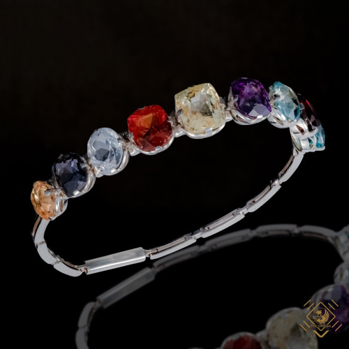 Prosta srebrna oprawa ma za zadanie wyeksponować dziewięć kamieni o różnych szlifach, kształtach i kolorach. Feeria barw doskonale zestawionych ze sobą kolorowych kamieni szlachetnych.