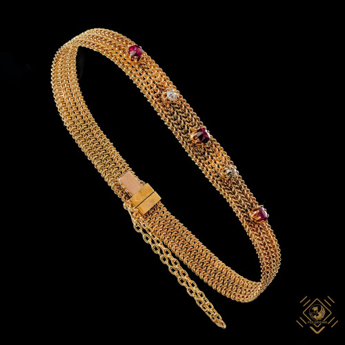 Bransoletka o ciekawym łańcuszkowym splocie, dyskretnie ozdobiona trzema rubinkami i dwoma diamentami. Niezwykle kobiecy wzór miękko układający się na dłoni. Dodatkowy atut to łańcuszek zabezpieczający zapięcie.