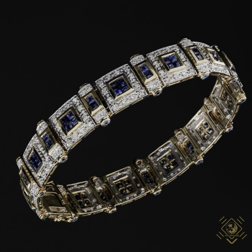 Segmentowa sekwencja geometrycznych elementów kameryzowanych diamentami w szlifie 8-cut oraz drobnymi szafirami. Co drugi element zakończony szafirowym kaboszonem. Wspaniała bransoleta utrzymana w stylistyce Art Deco.