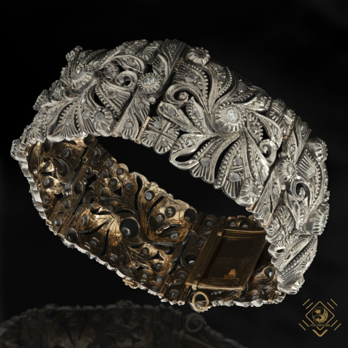 Niezwykle kunsztowna florystyczna konstrukcja wykonana w srebrze posadowionym na bazie złota. Dwanaście ruchomych na przemian ułożonych elementów mocowanych na zawiasach tworzy idealny, miękko otulający przegub wzór. Całość kameryzowana diamentami starego szlifu old mine cut oraz rozetami diamentowymi. Zapięcie ukryte we wzorze. Poezja ówczesnego złotnictwa.