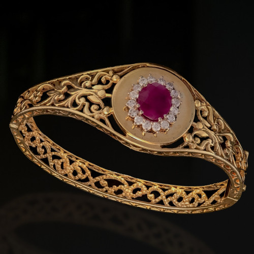 Bogato zdobiona ażurowa konstrukcja złożona z dwóch półobręczy połączonych zawiasem. W centralnej części w formie karmazycji osadzony rubin w diamentowym towarzystwie. Wspaniały blask diamentów doskonale podkreśla intensywną, głęboką amarantową barwę delikatnie fasetowanego korundu. Kunsztowna, ręczna praca złotnicza.