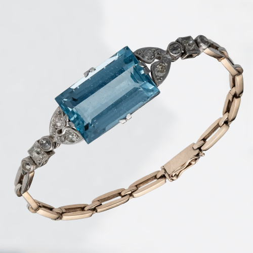 Brazylijski czternasto i pół karatowy akwamaryn w prostokątnym schodkowym szlifie, oprawiony w platynę osadzony centralnie. Wspaniały, głęboki błękit klejnotu delikatnie podkreślony poświatą diamentów starego szlifu oraz rautów diamentowych.
