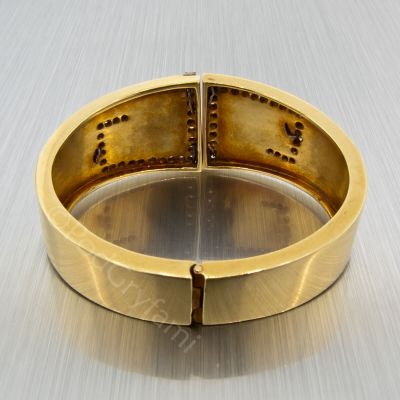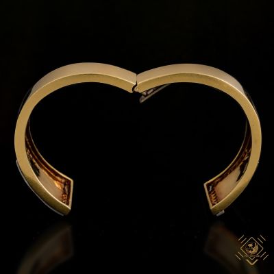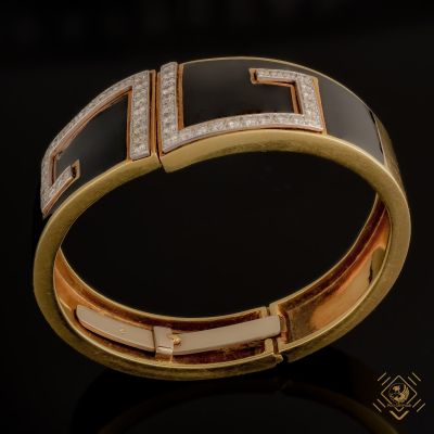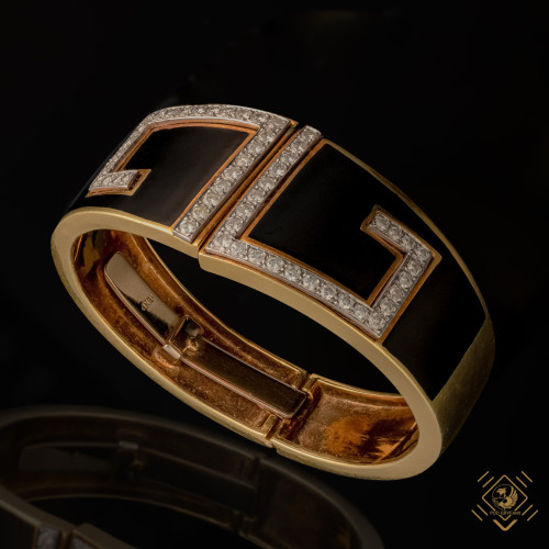 Klasyczne geometryzujące Art Deco. Wspaniała złota konstrukcja oparta na specjalnym zawiasie umożliwiającym otwieranie z przodu doskonale dopasowana do przegubu dłoni. Front dekorowany czarną emalią oraz kanałowo osadzonymi diamentami.