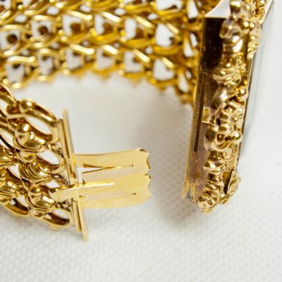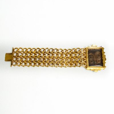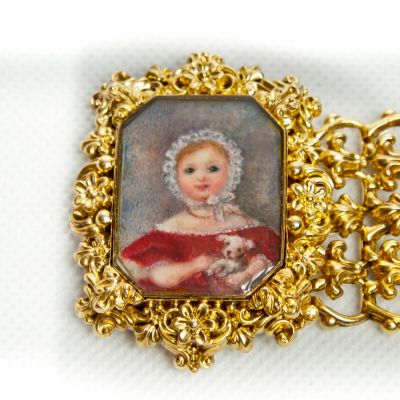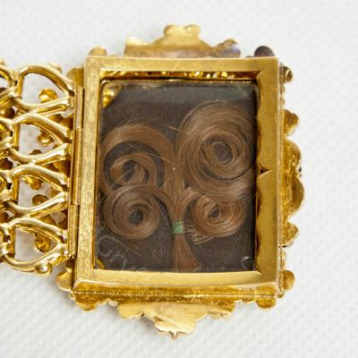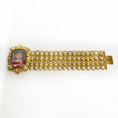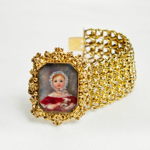 Niezwykłej urody biedermeierowska bransoleta wykonana w 1850 roku. Trzon bransolety wykonany ze złota dętego próby 585, zapięcie (język) 570. Natomiast ramki zabezpieczające miniaturkę z metalu nieszlachetnego. Całość pokryta złotem wyższej próby. W centralnej części bransolety od strony zewnętrznej umieszczony medalion zawierający miniaturkę z portretem małej dziewczynki. Od strony wewnętrznej fantazyjnie ułożony pod szkłem pukiel włosów. Bransoleta stanowi klasyczny przykład biżuterii biedermeierowskiej charakteryzującej się dużą precyzją kształtów, bogactwem dekorów i przepychem wzornictwa. Masywność wyrobów równoważyły niewielkie kamienie szlachetne bądź jak w przypadku tego klejnotu ciekawe ażurowe sploty oraz delikatność dętego złota. Chociaż styl ten wywodził się z Austrii i Niemiec to jednak szybko zdobył popularność w innych europejskich krajach. Czego doskonałym przykładem są portrety pięknych włoszek pędzla znakomitego włoskiego artysty Giuzeppe Tominza (1790-1866). Sportretowana przez niego w 1840 roku Amalia Tonello Cappeletti na przegubie swojej pięknej dłoni nosi bardzo podobny klejnot. Reasumując bransoleta jest absolutnie niepowtarzalnym i unikatowym klejnotem posiadającym wszelkie cechy obiektu muzealnego. Może stanowić uzupełnienie bądź zaczątek kolekcji tzw ,,biżuterii z duszą” lub po prostu cudowną i bardzo wartościową ozdobę.