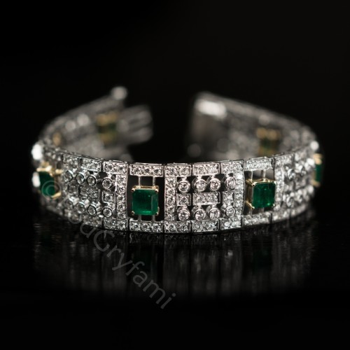 Bransoleta swoim geometrycznym kształtem nawiązuje do stylizacji Art Deco. Wykonana z 18 karatowego białego złota ozdobiona diamentami oraz idealnie dobranymi niewielkimi szmaragdami o ciemnozielonej barwie. Cenny klejnot doskonale układający się na przegubie kobiecej dłoni.