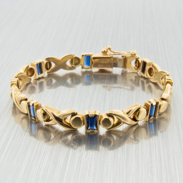 A delicate bracelet made of 14-carat gold, decorated with eight dark blue jewels. With safety clasp.