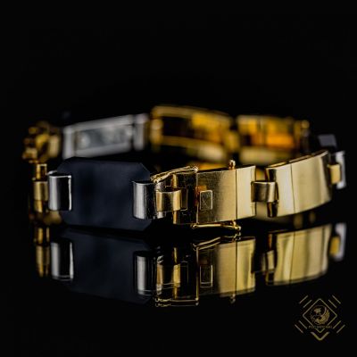 Wyrafinowany styl Art Deco niepodzielnie króluje od 1925 roku a więc od czasu słynnej paryskiej wystawy, chociaż precjoza w tej estetyce występowały już od 1915 roku. Prezentowana bransoleta powstała właśnie około 1925 roku. Jej piękną geometryczną formę podkreślają ośmiokątne onyksy przeplatane białym i żółtym złotem. Pięknie układająca się na przegubie dłoni bransoleta stanowi również zabytek epoki Art Deco.