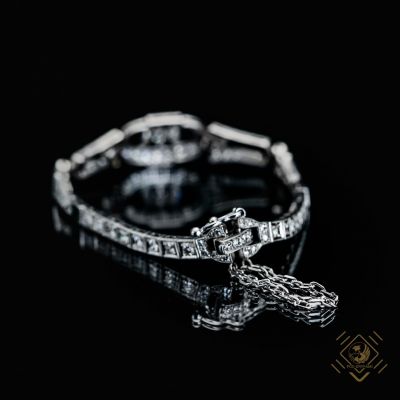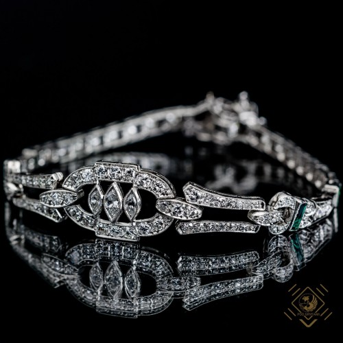 Jeden z piękniejszych przykładów klasycznego Art Deco. Idealnie dobrane diamenty połączone z delikatnie połyskującą bielą platyny ujęte w różnorodne geometryczne wzory doskonale odzwierciedlają klimat i szarm minionej epoki. Precyzja wykonania oraz niebywały kunszt złotnika znakomicie podkreślają urodę klejnotu.