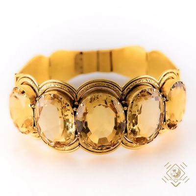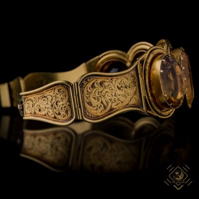 The gold, intricately chiseled setting is a remarkable background for five outstanding citrines. The stones of a rare color called vivid yellow have an oval facet cut. This beautiful variety of quartz was already known in Ancient Rome but it was the 19th century that saw its true blossoming. The gem was made in the nineteenth-century.