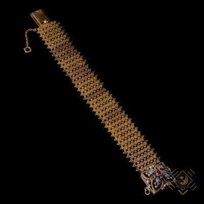 Maestria pracy jubilerskiej z pierwszej połowy XX wieku opieczętowana portugalskimi znakami probierczymi. Bransoleta o bardzo rzadko spotykanym splocie wykonana z dwubarwnego ponad 18-karatowego złota. Efektowne zapięcie w formie podzielonego na ćwiartki kwadratu. Każda ćwiartka zdobiona techniką millegrainu oraz niewielkim turkusem. Dodatkowym atutem jest łańcuszek zabezpieczający zapięcie.