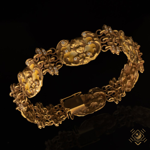 Piękna, efektowna bransoleta wykonana z niewielkich połączonych ze sobą elementów, z których co drugi zdobią putta. Blasku całości dodają diamenty oraz opalizująca emalia. Miękko układająca się na przegubie dłoni bransoleta nawiązuje swoim stylem do Art Noveau.