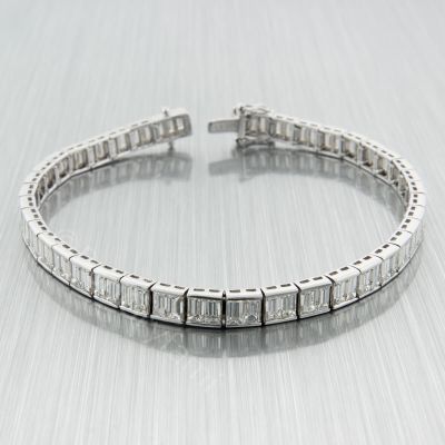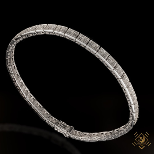 Doskonały przykład bransolety ,,tenisowej" gdzie w symetrycznym szeregu oprawione w białe złoto połyskują diamenty o szlifie bagiet. Bransolety tenisowe są niezwykle popularne dzięki uczestniczkom turniejów tenisowych Sereny Williams, Gabrieli Sabatini, czy też Chris Evert, dzięki, której zawdzięczają swą nazwę. Wspaniała ozdoba kobiecej dłoni na co dzień i na wyjście.