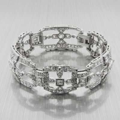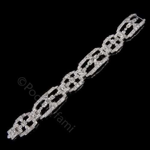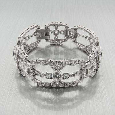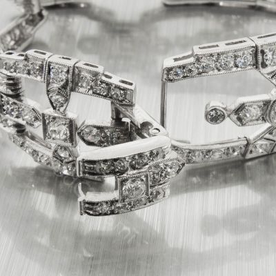 Cudowne lata 20-te, 30-te XX wieku , zachowana czysta forma Art Deco z nutą symetrii. Imponująca platynowa konstrukcja mocowana na zawiasach z bezpiecznym niemalże niewidocznym zapięciem. Majstersztyk ręcznej pracy złotniczej dekorowany diamentami w historycznych szlifach old european cut.