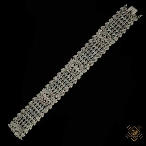 Klejnot powstał w XX wieku i stanowi doskonały przykład niezwykłego kunsztu mistrzów złotnictwa. Delikatna siateczkowa konstrukcja ozdobiona motywem liści laurowych. Całość kameryzowana diamentami w dwóch barwach bieli oraz delikatnej błękitnej poświaty. Na języczku zapięcia umieszczona sygnatura Domu Jubilerskiego Le Vian.