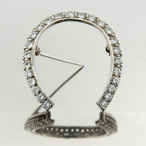 Symbol szczęścia ,,podkowa" tonąca w skrzących się diamentach. Delikatna brosza z dobrym zabezpieczeniem zapięcia.