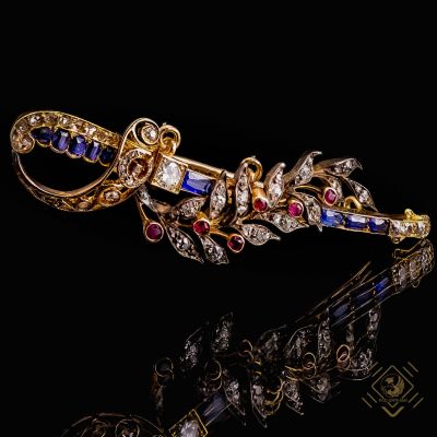 Niezwykły wiktoriański klejnot zaprojektowany jako szabla przepasana laurową gałązką. Broszę wykonano ze złota łączonego ze srebrem ozdobionego szafirami, rubinami, rozetami diamentowymi oraz idealnie dobranymi mieniącymi się delikatnym blaskiem diamentami. Klejnot powstał około 1895 roku w czasie tak zwanej ,,Złotej ery biżuterii". Rozwój przemysłu, nowe technologie i łatwiejszy dostęp do kolorowych kamieni szlachetnych umożliwił tworzenie absolutnie wyjątkowych wykonanych z doskonałą precyzją miniaturowych dzieł sztuki jubilerskiej. Broszę dzięki specjalnym uchwytom można nosić również jako efektowny wisior.
