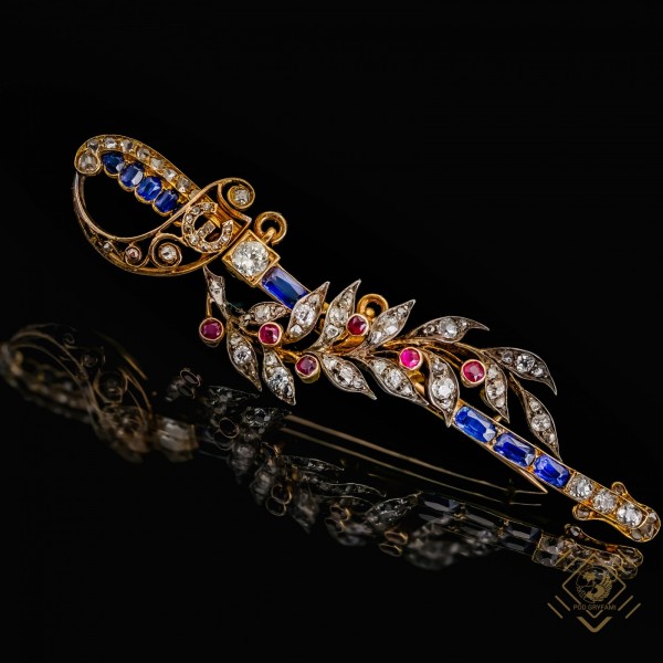 A remarkable Victorian jewel designed as a sabre with a laurel branch. The brooch is made of a gold-silver alloy and decorated with sapphires, rubies, diamond rosettes and perfectly fitting diamonds shimmering with a delicate glow. The jewel was created around 1895 during the so-called "Golden Age of Jewelry". The development of industry, new technologies and easier access to colorful precious stones enabled the creation of unique miniature pieces of jewelry made with excellent precision. Thanks to special handles, the brooch can also be worn as a spectacular pendant.