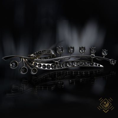 Brosza została wykonana w białym złocie i srebrze jako gałązka konwalii, której listki i dzwoneczki kwiatów są ozdobione diamentami. Klejnot powstał około 1900 roku a więc w okresie pełnego rozkwitu secesji. Płynne linie i motywy roślinne tak bardzo charakterystyczne dla secesji francuskiej sugerują iż brosza mogła powstać we Francji. Niestety nie posiada żadnych oznaczeń, a szkoda ponieważ precyzja wykonania świadczy o wysokim kunszcie artysty. Dodatkowym atutem jest dobrze zabezpieczone zapięcie.