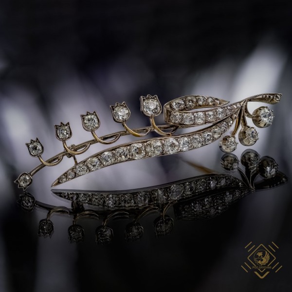 This brooch was made in white gold and silver in the shape of a lily of the valley, whose leaves and flowers are decorated with diamonds. The jewel was created around 1900, when Art Nouveau was in full bloom. Fluid lines and floral motifs so characteristic of French Art Nouveau suggest that the brooch could have been made in France. Unfortunately, it does not have any markings, which is a pity because the precision of the workmanship testifies to the artist's high craftsmanship. An additional advantage is a well-protected clasp.