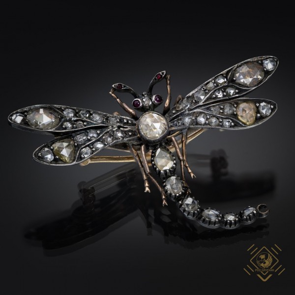 Silver gold dragonfly design filled with Antwerp diamond cut rosettes. The eyes and antennae of the insect is adorned with small rubies. Designs of jewelry from the turn of the century perfectly fit the aesthetics of the late Art Nouveau era. Fascination with the world of nature is reflected in a faithful representation of the surrounding reality. Fauna and flora became the favorite motifs of goldsmiths. This brooch is a perfect example of the unusual craftsmanship and precision of workmanship, finesse of form and perfectly matched stones. A real treat for lovers of zoomorphic representations in jewelry with the irresistible charm of old jewels.