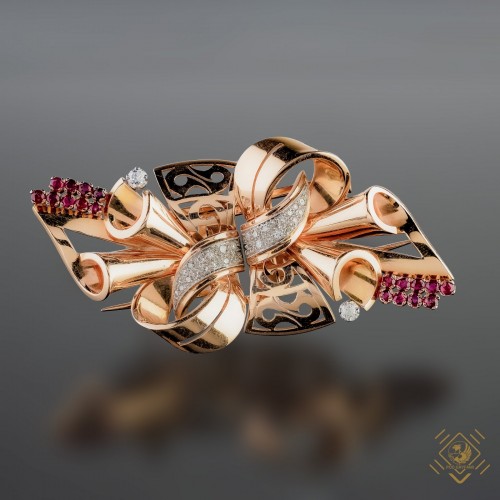 Oficjalnie za kres epoki Art Deco przyjmuje się rok 1939 ale jej reminiscencje odnajdujemy również w latach 40 i 50-tych XX wieku. Prezentowana brosza jest tego znakomitym przykładem, powstała na przełomie lat 30 i 40-tych XX wieku. Złotnik zaprojektował ją w formie fantazyjnej kokardy, której złote przeplatające się ze sobą wstęgi zostały ozdobione lśniącymi niewielkimi diamentami oraz drobnymi krwistoczerwonymi rubinami. Całość stanowią dwa elementy połączone w broszę, które po rozłożeniu można nosić oddzielnie.