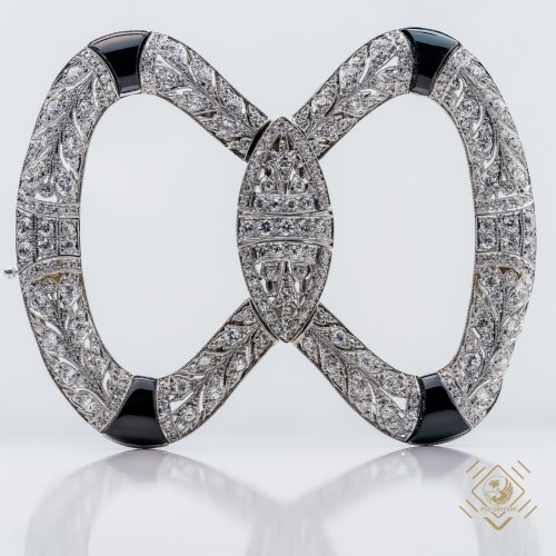 Niezaprzeczalny urok motywu kokardy w połączeniu z subtelnym wręcz koronkowym motywem florystycznym wypełnionym diamentami starego szlifu europejskiego. Żywy ogień diamentów podkreślony blaskiem platyny przełamany dla kontrastu głęboką czernią onyksu. Rzadko spotykany klejnot służył jako klamra do włosów podkreślając urodę i status społeczny właścicielki. Klamra wpisując się w nurt biżuterii edwardiańskiej urzeka nie tylko wysublimowaną kompozycją, pięknem kamieni starego szlifu ale również profesjonalnym wykonaniem. Szczegóły