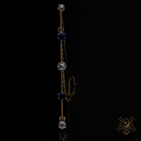 This simple brooch, made at the beginning of the twentieth century, is decorated with three old mine cut diamonds and two Ceylon sapphires. The jewel was created in the Edwardian Age. During the reign of King Edward VII, the British Empire strengthened its power even more than in the Victorian period, and the jewelry made during this period highlighted the importance of its wearer. Of course, the dominant items were magnificent tiaras, necklaces, earrings, bracelets or brooches, but there was no shortage of subtle, delicate, symmetrical, classical jewels, as exemplified by the piece here described.