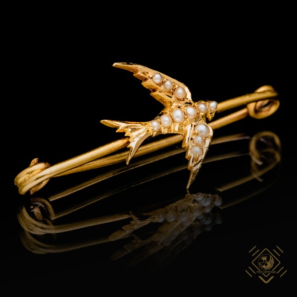 A delicate, small brooch with a swallow motif decorated with tiny pearls. The themes of flora and fauna, realistically depicted birds, insects, snakes, flowers, leaves, ivy twigs or vines – spread in the middle of the 19th century after the 1851 London World Exhibition. These motifs were particularly beloved in a later era by the Art Nouveau movement. In addition, this subtle gem is given a unique character by the swallow, which is a symbol of good hope and a longing for freedom.
