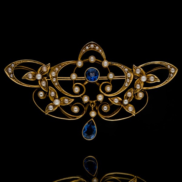 Subtlety, femininity, finesse. These three words perfectly describe this fine piece from the Edwardian Era. Its fantastical form with a floral motif is accented by small creamy pearls and two centrally set sapphires. Highly recommended to connoisseurs of the era and lovers of jewelry with a soul.