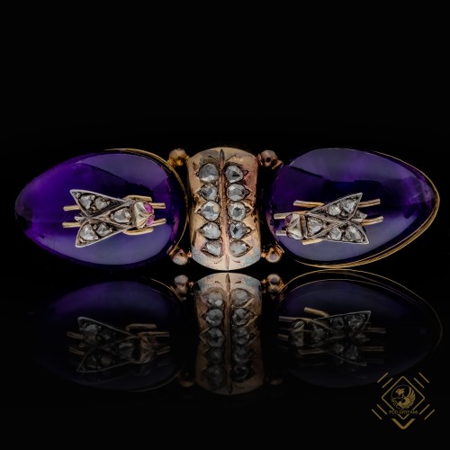 Rzadki okaz kolekcjonerski z ponadczasowym urokiem i klimatem epoki wiktoriańskiej. Na styl biżuterii II połowy XIX wieku wielki wpływ miały szybko rozwijające się nauki przyrodnicze. Po 1850 roku w złotnictwie lawinowo pojawiają się nowe motywy dekoracyjne wiernie odzwierciedlające naturę. Przedstawienia roślinne i zoomorficzne w projektach biżuterii znajdują uznanie wśród elit ówczesnej Europy. Konstrukcja broszy została wykonana ze złota w formie dwóch toczących ze sobą walkę żuków wiosennych ( trypocopris vernalis ) , których niezwykle opalizujące pancerze znakomicie oddają dwa ciemnofioletowej barwy ametysty w szlifie kaboszonów. Na grzbietach chrząszczy przysiadły dwie diamentowo lśniące muchy, których rubinowe oczy oddają powagę i grozę owadziej walki. Doskonały warsztat jubilerski, żywy ognień diamentowych rozet, wspaniała barwa ametystów sprawia, że jest to klejnot nie tylko dla miłośniczek Epoki ale również obiekt muzealny.