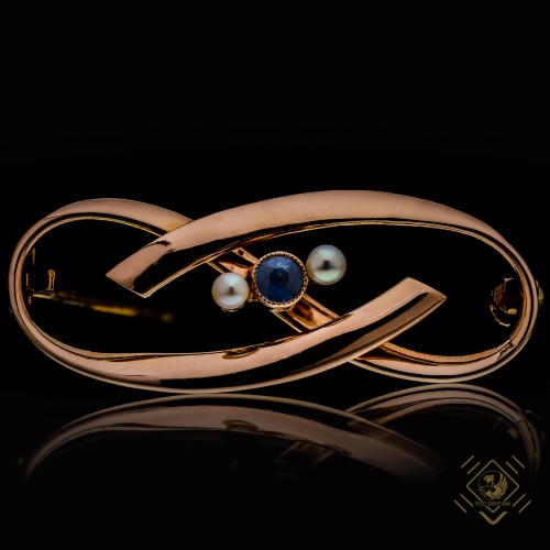 Falujący kształt broszki z centralnie osadzonym niewielkim szafirem oraz dwoma perełkami nawiązuje do symbolu nieskończoności. Delikatna, wykonana z dętego złota konstrukcja będzie doskonałym dodatkiem do eleganckiego kobiecego stroju.