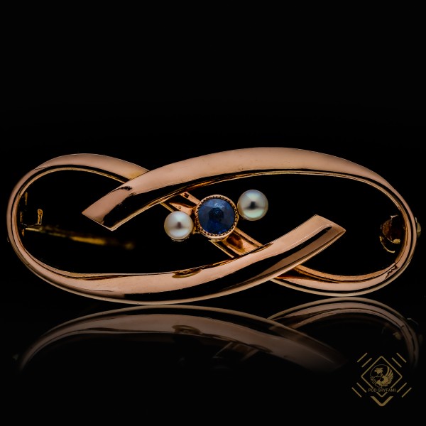 The wavy-shaped brooch with a centered small sapphire and two pearls is in the shape of the infinity symbol. The delicate gold construction will be a perfect addition to an elegant lady's outfit.