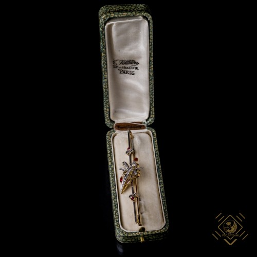 Kolejny przykład realistycznego odtworzenia natury w jubilerstwie. Urocza diamentowa ważka posadowiona na lekkiej wykonanej ze złota konstrukcji. Trzy czerwone okrągłe rubinki oraz dwa granaty w szlifie markizy tworzą wyrazisty kontrast dla lśniących diamentowych rozet. Brosza zachwyca nie tylko finezją formy, pięknem kamieni ale również kunsztem pracy jubilerskiej. Dodatkowym atutem klejnotu jest precyzyjnie wykonane zabezpieczenie zapięcia.