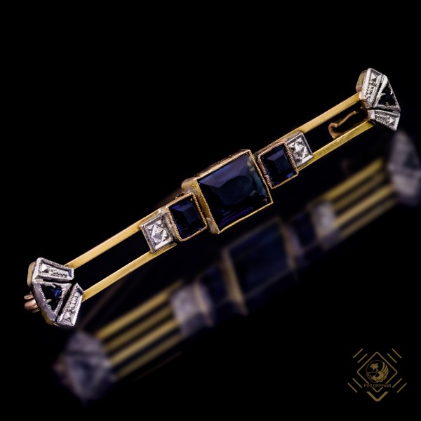 Art Deco in its purest form. The beautiful geometric piece made in gold is decorated with very precisely cut dark blue glass. For connoisseurs of the era, however, this will come as no surprise. The Art Deco style was characterized not only by geometric shapes, symmetry and simplicity of form, but also sophistication, elegance and functionality as well as a very diversified selection of stones and precious metals. Not only precious metals and precious stones were used, artificial jewels (plastic, bakelite, glass, synthetic stones) and mixed jewelry such as gold and glass became very fashionable.