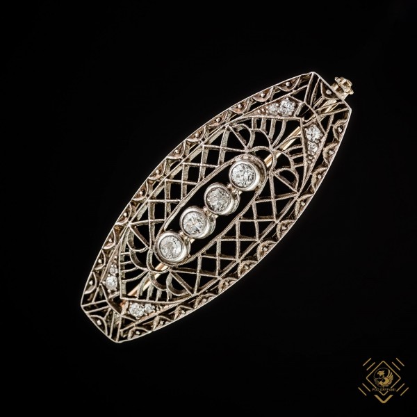 A classic brooch from the turn of the 19th and 20th centuries. Small old mine cut diamonds embedded in a gorgeous silver openwork structure. The upper part of the brooch is decorated using the Milgrain technique. Clasp base, and pin with additional security, made of 14 carat gold.