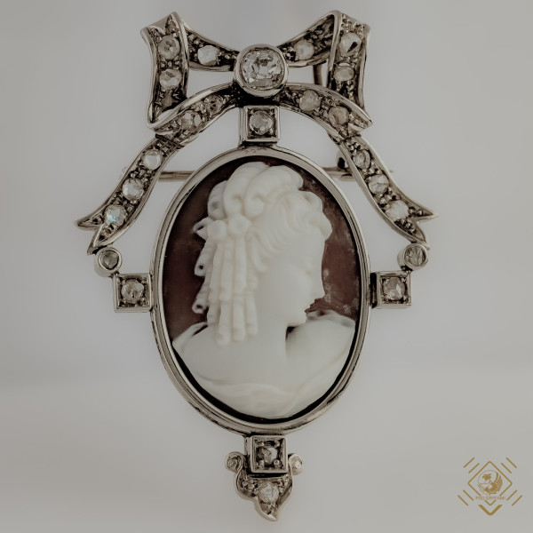 An impressive cameo made in a sea shell (Conchifera) dating from the turn of the 19th and 20th centuries, designed as a brooch with the function of a pendant. A wonderful bow motif crowns the oval frame with the image of a young aristocrat. An old cut diamond (old mine cut) is found in the central part of the bow.