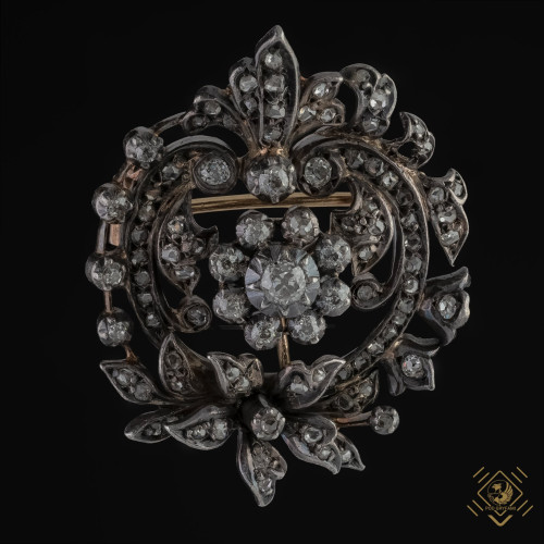 Wielostopniowa, przestrzenna srebrno - złota konstrukcja z delikatną nutką secesji zdobiona diamentami starego szlifu oraz dyskretnie połyskującymi rozetami diamentowymi. Wspaniały przykład biżuterii antykwarycznej prezentujący wysoki kunszt artystyczny ręcznej pracy złotniczej.