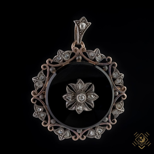 Okres Wielki biżuterii wiktoriańskiej to ponadczasowa klasyka czarująca swoją symboliką. Dominacja kamieni szlachetnych o zdecydowanie ciemnej barwie w połączeniu z diamentami oraz rozetami diamentowymi to bardzo charakterystyczne elementy wykorzystywane do wykonywania klejnotów. Brosza zachwyca idealnie okrągłą formą oraz niezwykłym kunsztem pracy jubilerskiej. Historyczny egzemplarz biżuterii dwufunkcyjnej.