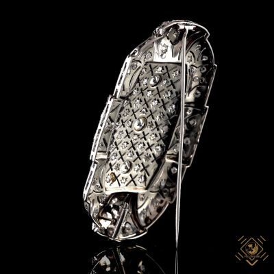 Klasyka Art Deco. Koronkowa, ręczna praca w platynie zdobiona diamentami starego szlifu ( old european cut ) oraz rozetami diamentowymi. Elegancja i wyrafinowanie stylu podkreślone geometryczną formą z zachowaną nutą symetrii. Majstersztyk pracy złotniczej, nadający subtelności i finezji broszy o tak okazałych rozmiarach.