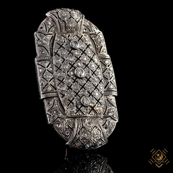 An Art Deco classic. Hand made lace style in platinum, decorated with old cut diamonds (old European cut) and diamond rosettes. The elegance and sophistication of the style is emphasized by symmetrical geometric form. A masterpiece of goldsmith work, giving subtlety and finesse to a brooch of such an impressive size.